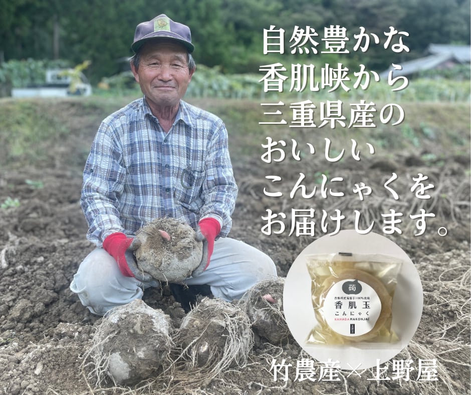 芋の素朴な風味とこんにゃく本来のしっかりとした歯切れの良い弾力が癖になる本格派の玉こんにゃく。三重県松阪市飯高町で栽培された香肌峡産のこんにゃく芋(香肌玉)を100%使用し、昔ながらのバタ練り製法で製造した、げんこつ大の大きな玉こんにゃくです。手でちぎって煮物に使ったり、さっとゆでて、ホクホクをしょうが醤油で食べるのもおすすめです。